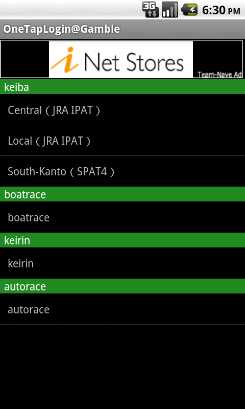 "OneTapLogin@Gamble" is an application which saves login information and can log in to the vote site of a municipally operated race by a one tap. Login information is attached to each vote site, and can be saved to five. The vote site which can be used now is as follows. - Central (JRA-IPAT) - Local (JRA-IPAT) - South-Kanto (SPAT4) - boat race - keirin - autorace When this application is used, not all responsibility carries out whether he would like to produce now [ negative ] to all problems, such as becoming damage, an obstacle, etc. Screen images of "OneTapLogin@Gamble" for Android